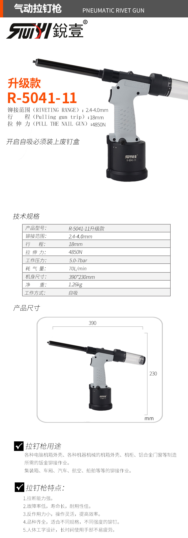 锐壹升级款R-5041-11自吸加长款拉钉枪